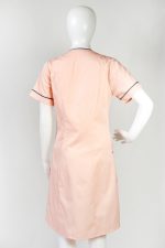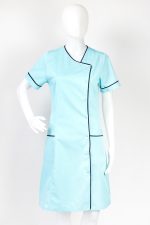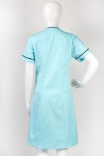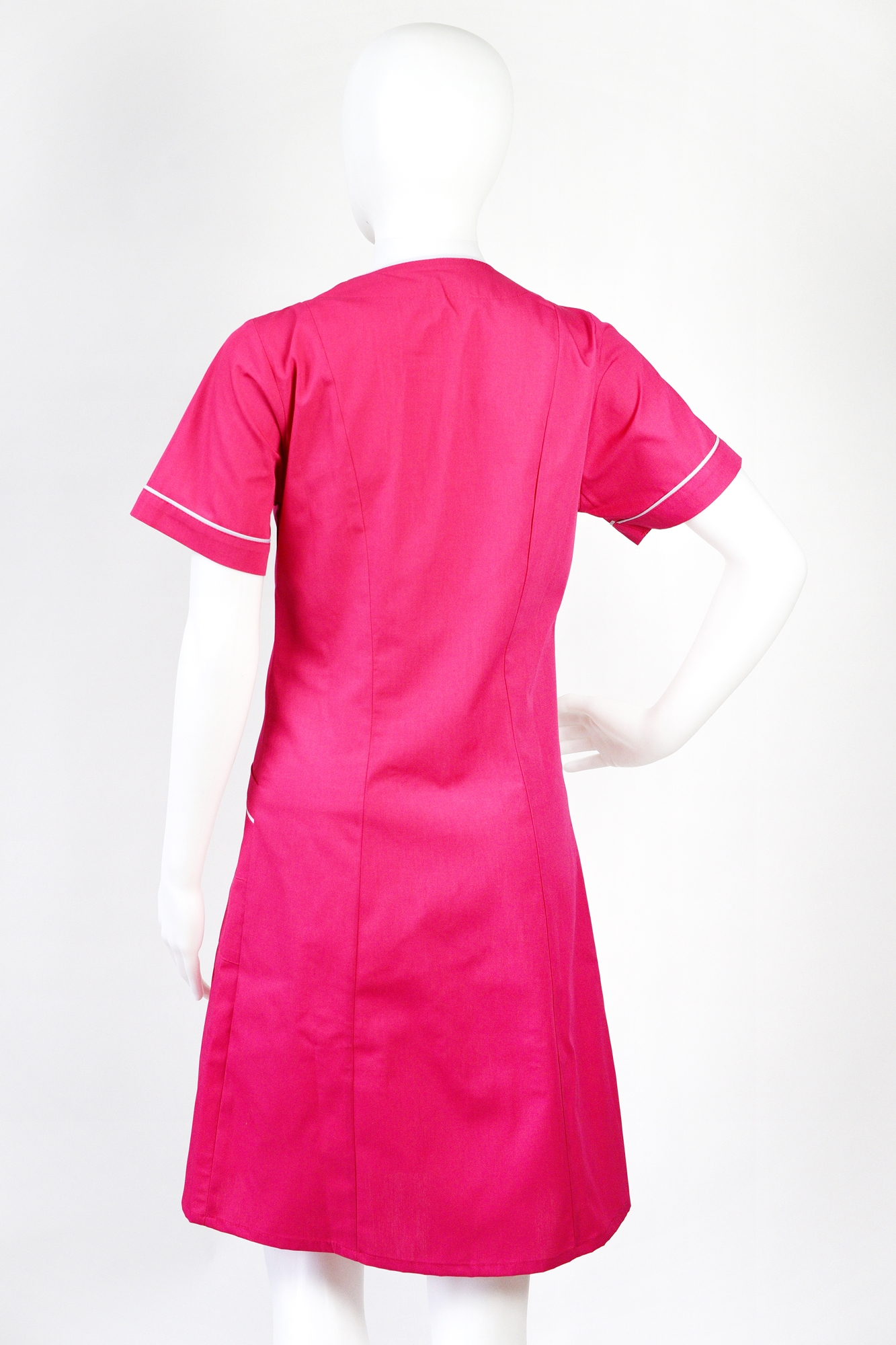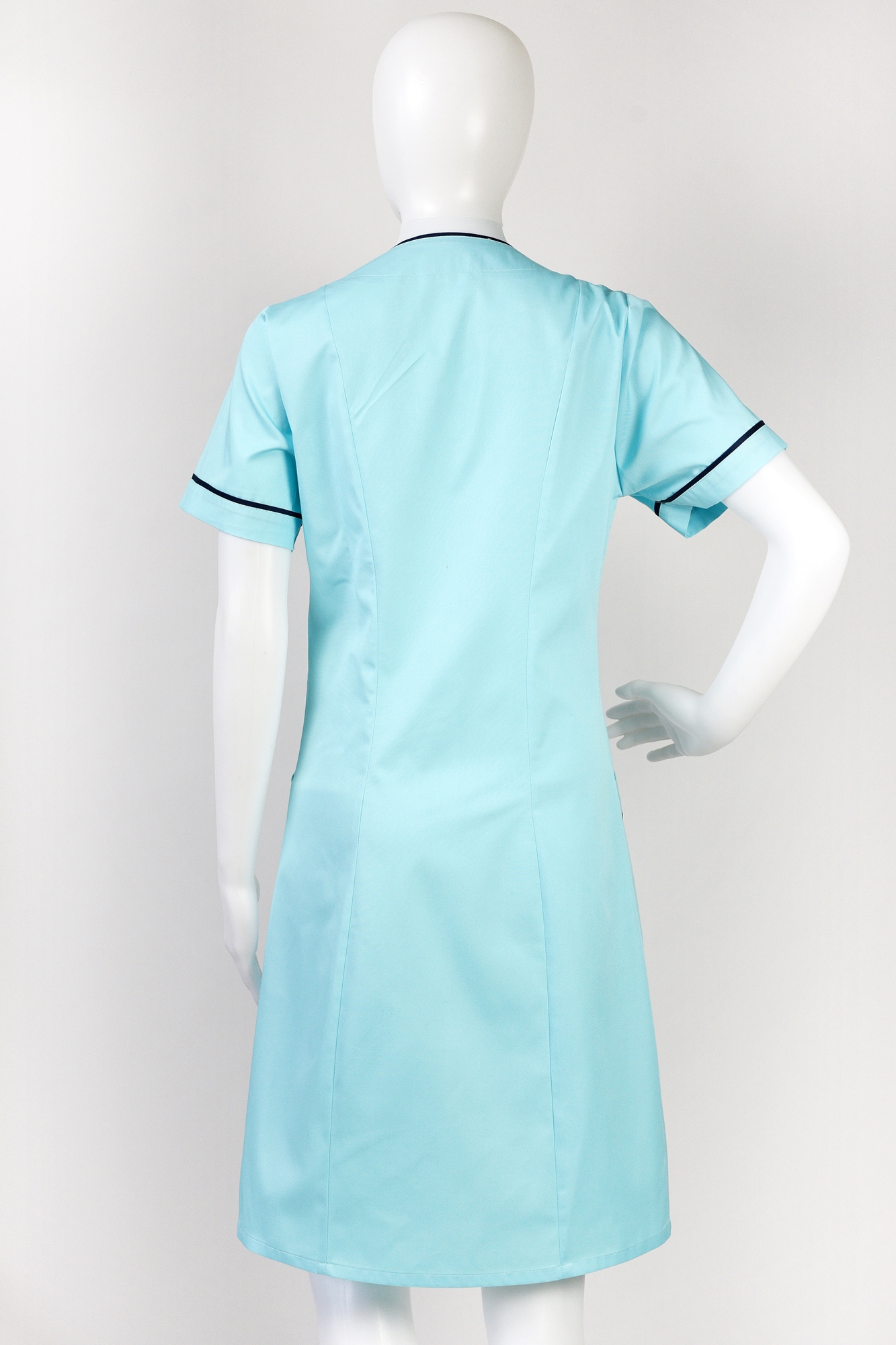 Wyjątkową ozdobą tej sukienki jest kolorowa lamówka, która przebiega wzdłuż cięcia, kieszeni i rękawa, dodając jej subtelnej nuty koloru i stylu. Dopasowanie w talii podkreśla kobiecą sylwetkę.